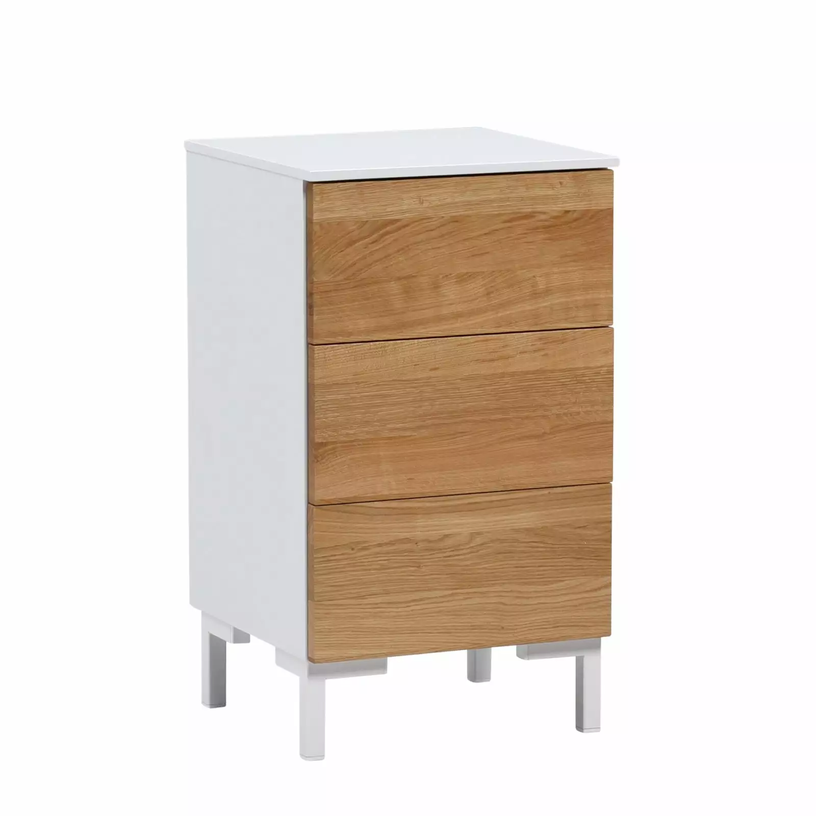 Helsinki-koivusarjan etulevyiltään tammipuinen pikkulipasto ihastuttaa yöpöytänä. Puunvärisiltä osiltaan lakatun tammisessa ja rungoltaan valkoiseksi sävytetyssä koivuisessa lipastossa on rungon kanssa samanväriset metalliset jalat. Kaksivärinen laatikosto on helppo yhdistää malliston huonekaluihin, joista yhdessä saa koottua linjakkaan kalustekokonaisuuden kokonaan ilman vetimiä. Viimeistelty työnjälki näkyy kalusteissa sisustoja myöten.