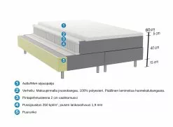 Patjan makuupinnalla on joustokangas, joka parantaa jousiston kykyä muotoutua kehon mukaan. Verhoiluna vahva laminoitu kangas sisustuksellisessa harmaan värissä.