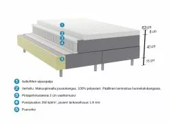Patjan makuupinnalla on joustokangas, joka parantaa jousiston kykyä muotoutua kehon mukaan. Verhoiluna vahva laminoitu kangas sisustuksellisessa harmaan värissä.