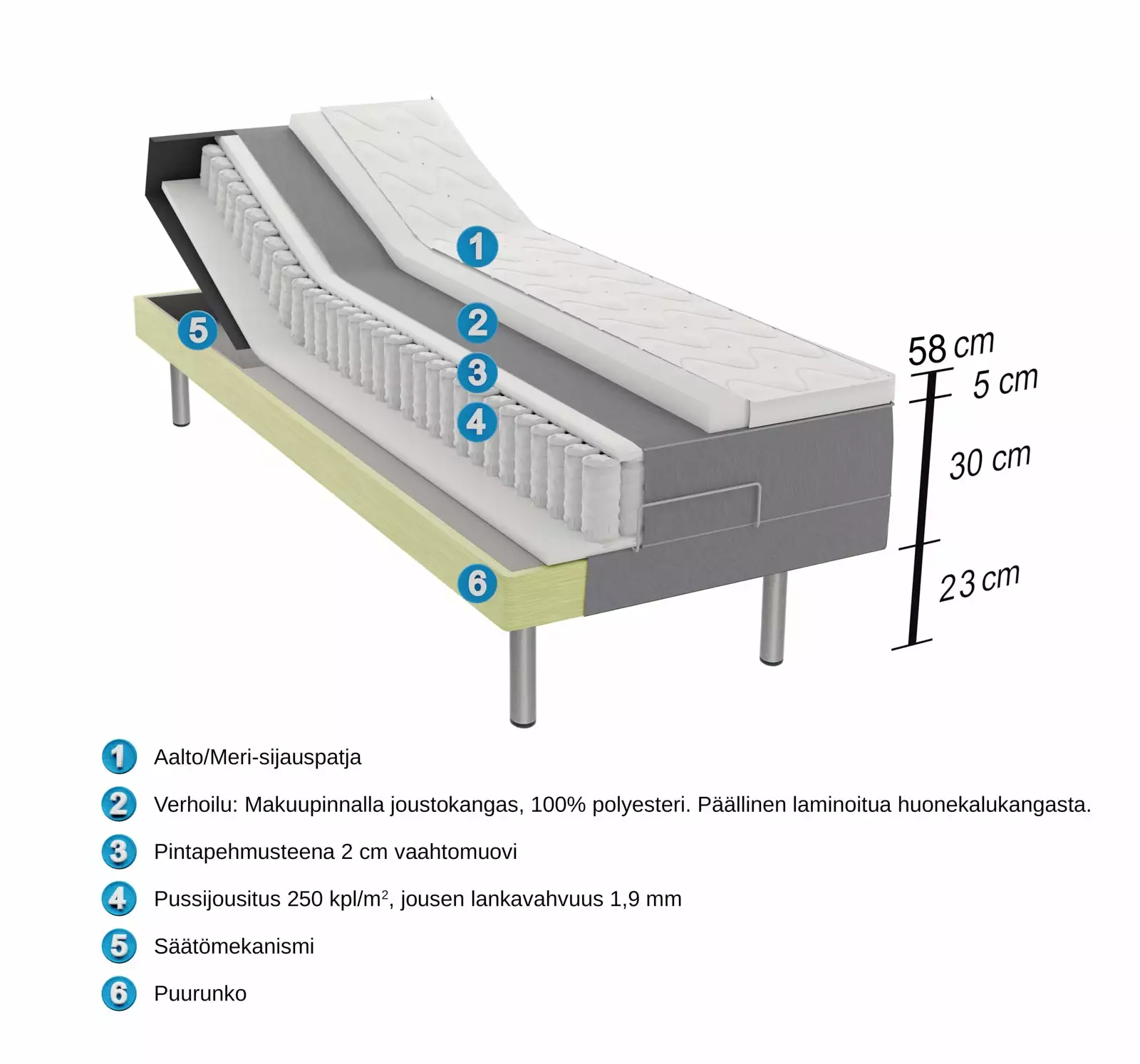 Aalto-moottorisängyn patjan pussijousitus myötäilee kehoa erinomaisesti ja tekee nukkumisesta miellyttävämpää ja rauhallisempaa. Verhoiluna vahva laminoitu kangas sisustuksellisessa harmaan värissä. Nukkujan painosuositus on 70 – 100 kg.