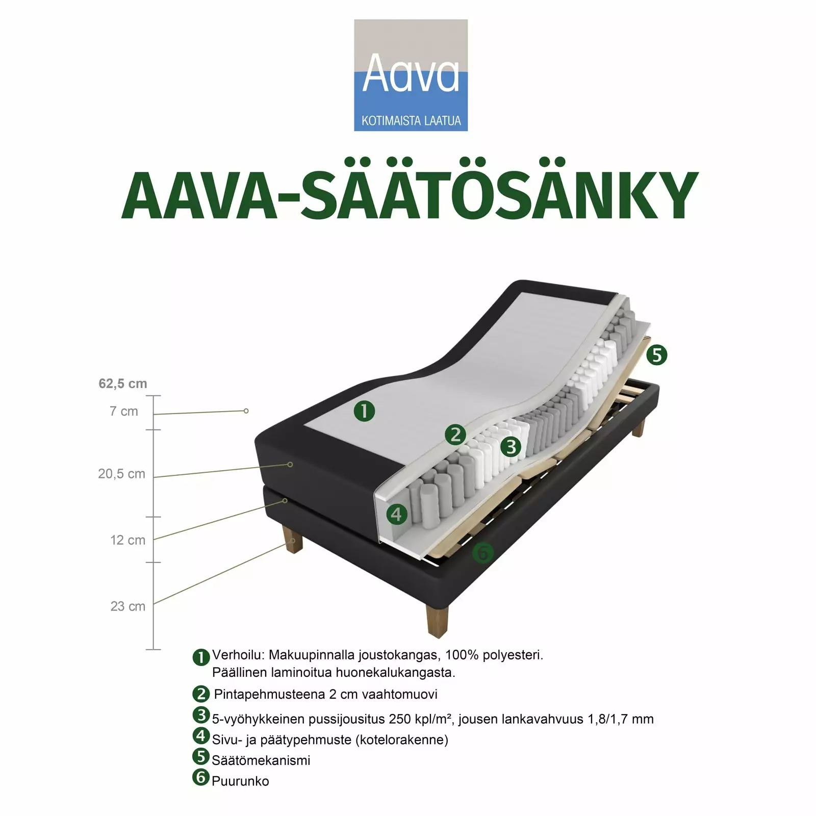 Aava -moottorisängyn toimintoja ohjataan langattomalla radioaalto-ohjatulla kaukosäätimellä. Aava -säätösängyn joustinpatjassa on korkea ja erinomaisesti kehoa myötäilevä 5-vyöhykkeinen pussijousitus, joka tekee nukkumisesta miellyttävän rauhallista. Patjassa on jämäkkä keskiosa ja hartiakevennys – näin ollen lantion alla on jämäkkä vyöhyke, joka taas hartiaseudulla on pehmeämpi. Patjan pintapehmusteena on jämäkkä pintavaahto ja makuupinnalla joustokangas, joka parantaa jousiston kykyä muotoutua kehon mukaan. Kokonaisuus voidaan viimeistellä yhteensopivalla sängynpäädyllä.