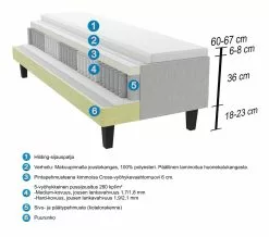 5-vyöhykkeinen pussijousitus yhdistettynä vyöhykkeisiin jaettuun Cross-erikoisvaahtomuoviin tarjoaa parhaan mahdollisen tuen. Yksilöllisesti parhaan patjan kovuustuntuman löytämiseksi kannattaa kokeilla eri vaihtoehtoja Stemma-myymälässä. Myymälässä sinulla on myös mahdollisuus räätälöidä juuri tarpeisiisi sopiva sänkykokokonaisuus. Petauspatjoja on saatavana useita erilaisia ja sijauspatjan valinnalla säätelet vuoteen pintapehmeyttä. Sängyn ulkonäköön voit vaikuttaa valitsemalla mieluisan jalkamallin. Puisia jalkoja on saatavana useissa eri väreissä ja valikoimassa on myös metallisia jalkamalleja.