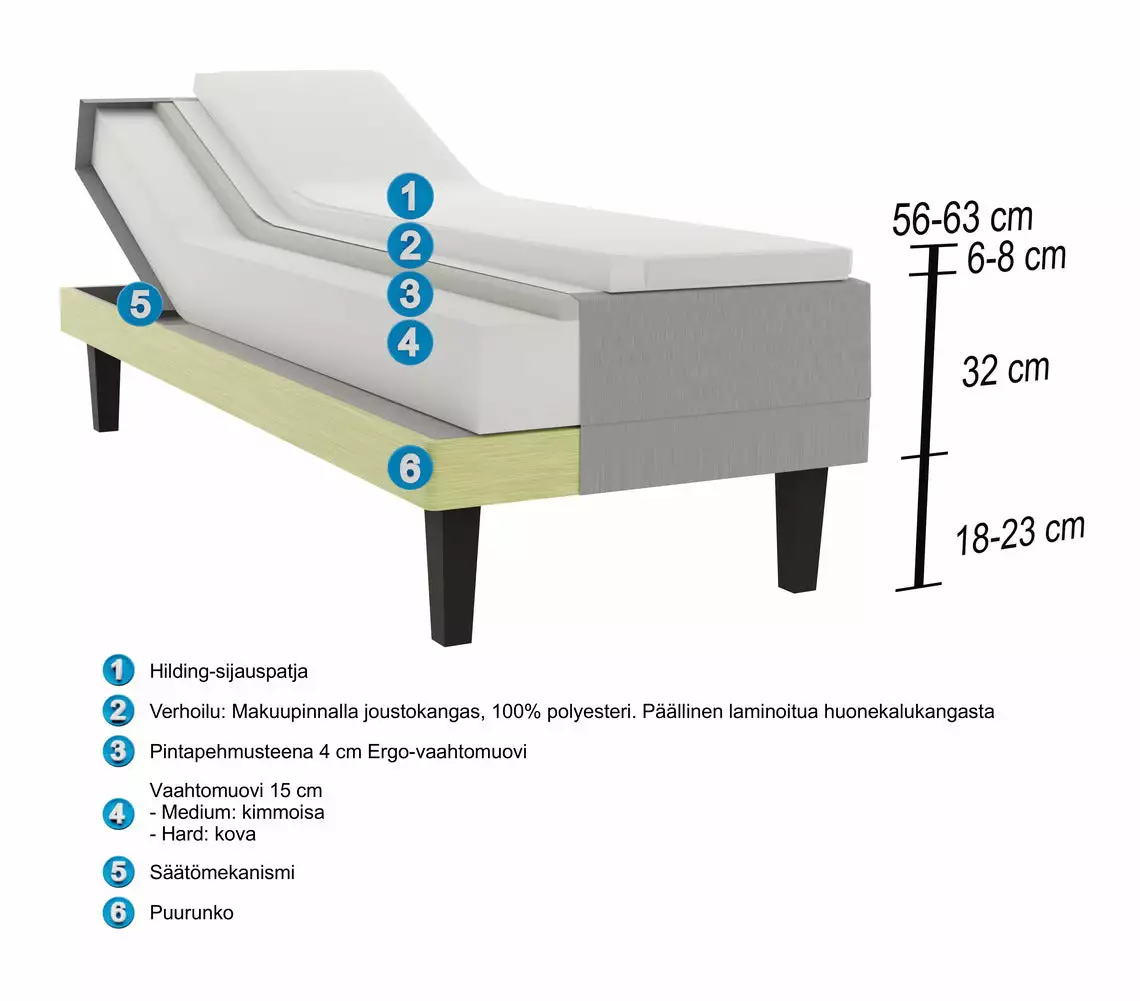 Saatavana on kaksi eri kovuusvaihtoehtoa. Hilding Feel Ergo -moottorisängyssä on vahva hiljainen moottori ja sängyn toimintoja ohjataan langattomalla kaukosäätimellä. Sänkykokonaisuus voidaan viimeistellä yhteensopivalla kätevällä tarviketaskulla.