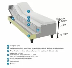 Valittuasi patjan jousituksen saat vielä säädettyä patjan tuntumaa valitsemalla käyttöösi käännettävän joustinkasetin pehmeämmän tai jämäkämmän puolen. Patjan makuupinnalla on joustokangas, joka parantaa jousiston kykyä muotoutua kehon mukaan. Sänkykokonaisuus voidaan viimeistellä yhteensopivalla sängynpäädyllä ja kätevällä tarviketaskulla.
