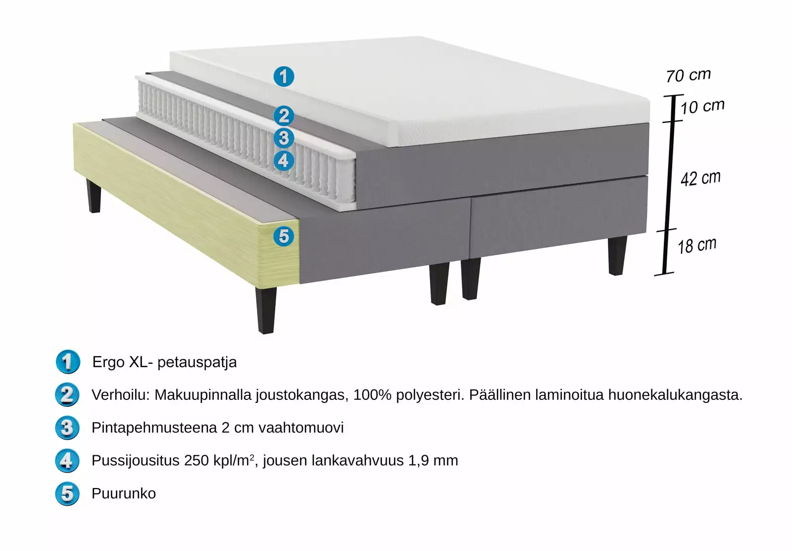 Meri Ergo XL -jenkkisängyssä on pussijousitus, joka myötäilee kehoa erinomaisesti ja tekee nukkumisesta miellyttävämpää ja rauhallisempaa. Käännettävän yläpatjan eri puolilla on erilainen tuntuma ja voit valita käyttöösi mieluisamman tuntuman, joko pehmeämmän tai kovemman puolen. Patjan makuupinnalla on joustokangas, joka parantaa jousiston kykyä muotoutua kehon mukaan. Paksu ja muhkea Meri Ergo XL memory foam -sijauspatja viimeistelee tuntuman ja nukkumismukavuuden. Sängynpäädyllä viimeistelet halutesssasi makuuhuoneesta ja vuodekokonaisuudesta sisustuksellisen näyttävän!