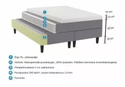 Meri Ergo XL -jenkkisängyssä on pussijousitus, joka myötäilee kehoa erinomaisesti ja tekee nukkumisesta miellyttävämpää ja rauhallisempaa. Käännettävän yläpatjan eri puolilla on erilainen tuntuma ja voit valita käyttöösi mieluisamman tuntuman, joko pehmeämmän tai kovemman puolen. Patjan makuupinnalla on joustokangas, joka parantaa jousiston kykyä muotoutua kehon mukaan. Paksu ja muhkea Meri Ergo XL memory foam -sijauspatja viimeistelee tuntuman ja nukkumismukavuuden. Sängynpäädyllä viimeistelet halutesssasi makuuhuoneesta ja vuodekokonaisuudesta sisustuksellisen näyttävän!