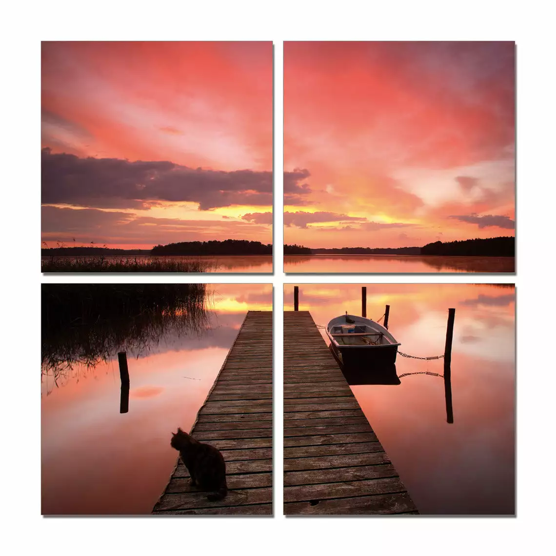 Näyttävä neljästä taulusta koostuva kokonaisuus tuo tunnelmaa sisustukseen. Kuvassa neljä taulua yhdistyy kauniiksi mökin rantamaisemaksi iltaruskon väriloiston aikaan. Kuvien painamisessa käytetään laadukasta öljypohjaista mustetta, jolloin värit ovat luonnolliset ja kirkkaat.