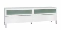 Lumo-sarjan ihastuttavassa leveässä tv-tasossa on oikeanlaiset säilytystilat medialaitteille, läpiviennit johdoille sekä tietenkin sopivasti tilaa tv:lle ja mahdollisille oheislaitteille. Yläosan laitetiloissa on klaffiovet etsatulla lasilla ja alaosassa on laatikot. Voit myös valita Lumo-tv-tason joko 5,5 cm korkealla jalkasokkelilla tai 10 cm korkeilla jaloilla. Malliston eri osista yhdistelemällä saa koottua yksilöllisiä ja toimivia kokonaisuuksia.