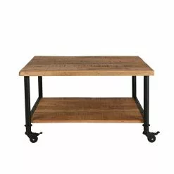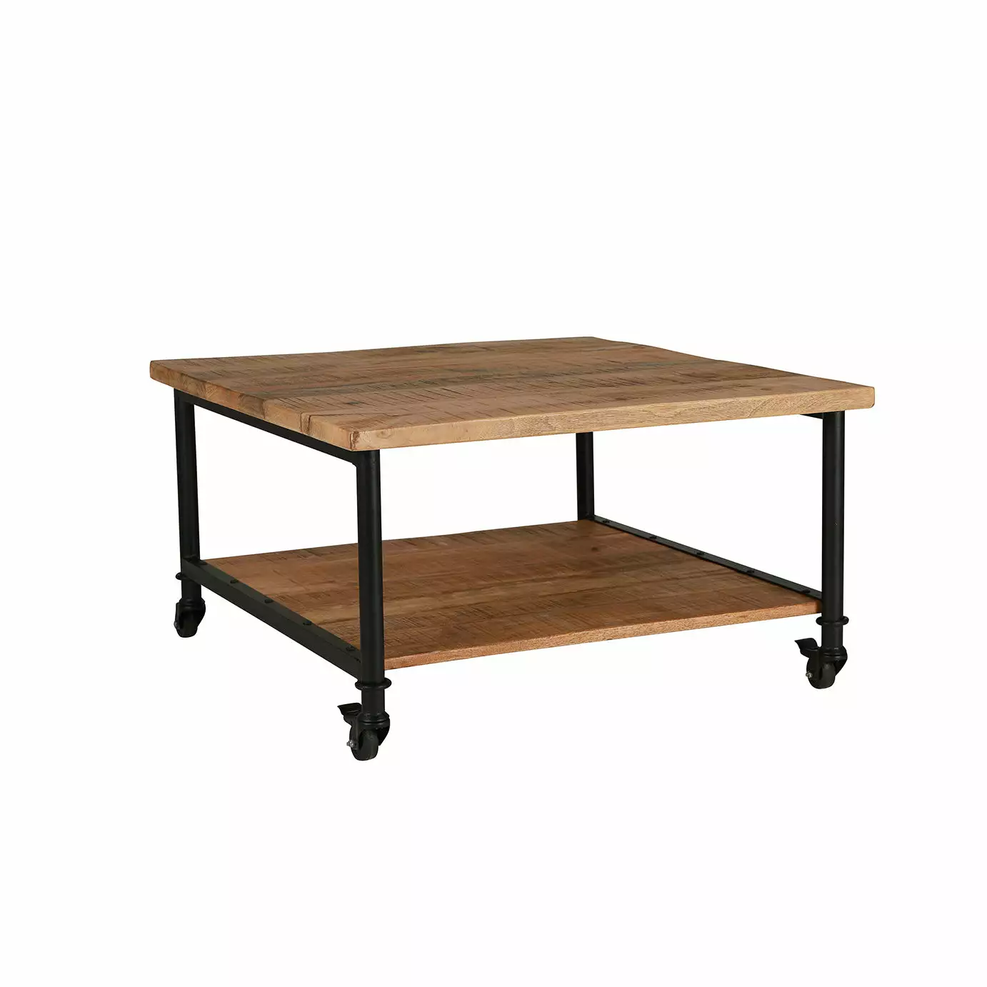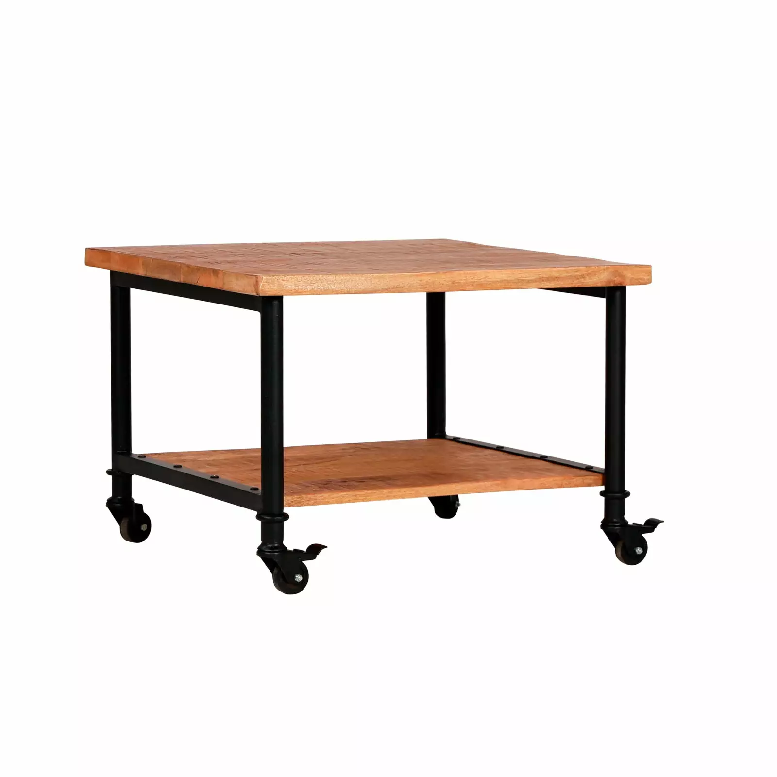 Tunnelmallinen Storage-sohvapöytä tuo eleganttia ilmettä sisustukseen. Monikäyttöisessä sohvapöydässä on mustat metalliset jalat lukittavilla pyörillä. Yksilölliset puiset kansilevy ja alataso ovat kestävää ja rouhean vaikutelman antavaa mangopuuta, joka sisustusmateriaalina huokuu kodikasta lämpöä.