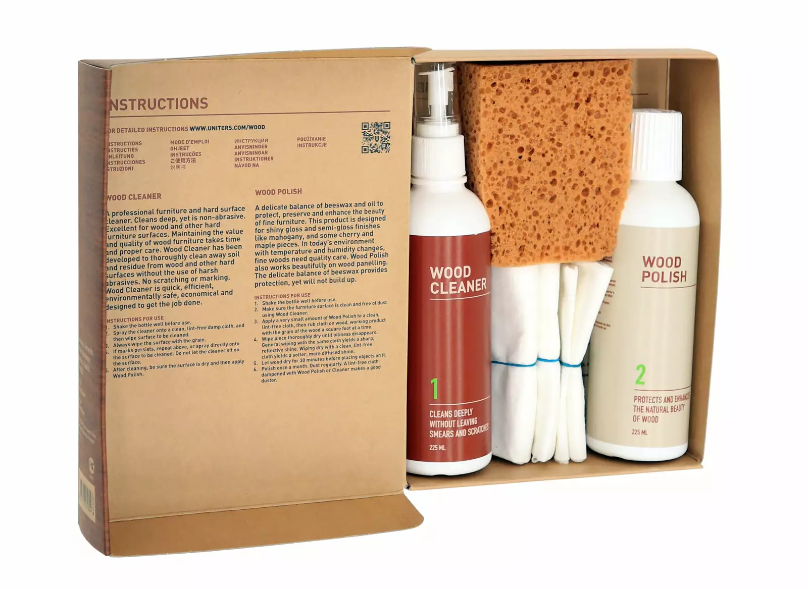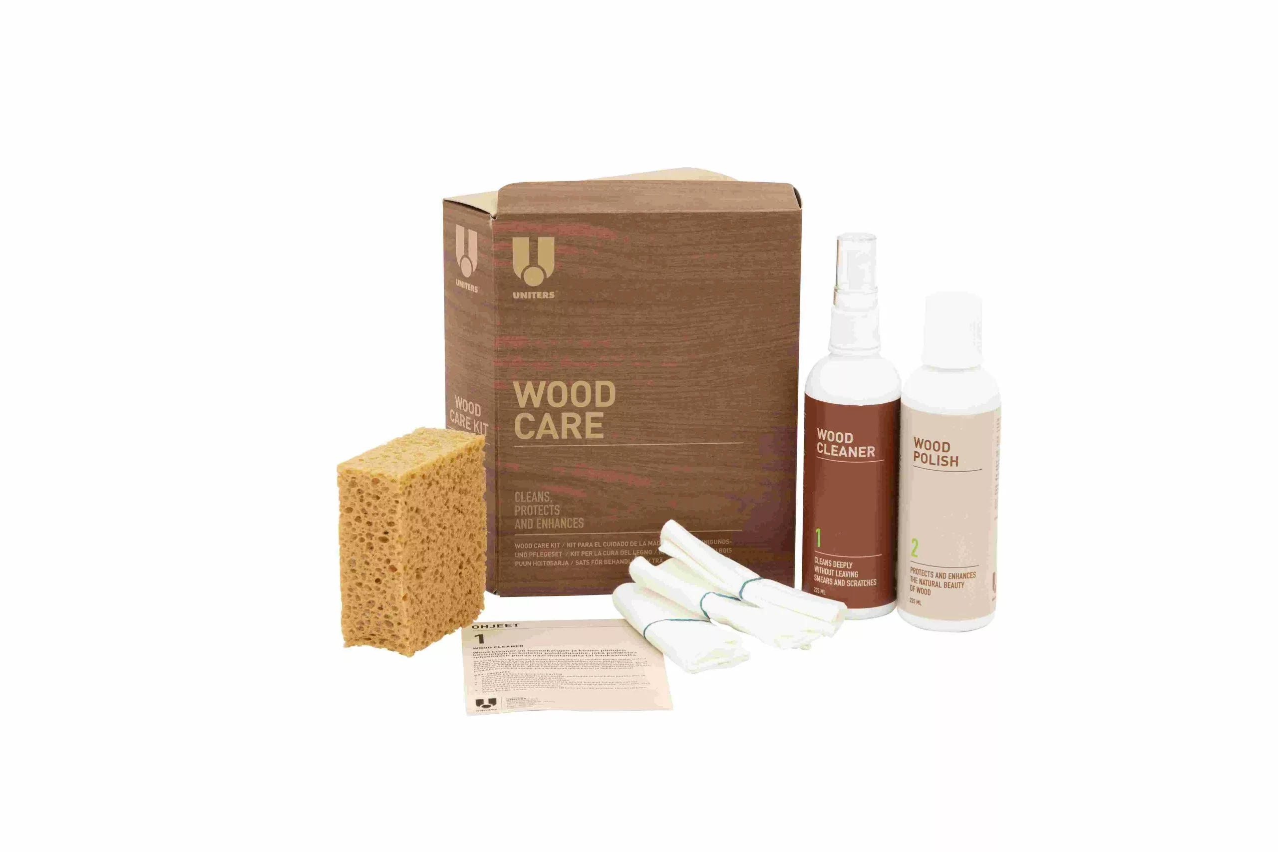 Wood Master Wood Care -hoitosetti sisältää sisätilojen puisten huonekalujen ja sisustuselementtien puhdistukseen, hoitoon ja suojaukseen tarvittavat tuotteet. Setti sisältää lisäksi naarmujen värjäystuotteita: värisävyjä vaaleasta tuhkasta tummaan mahonkiin. Hoitosetin tuotteet ovat vesipohjaisia ja ympäristöystävällisiä.