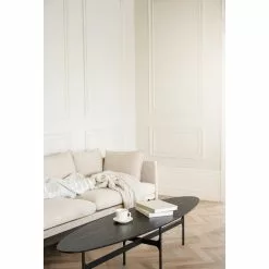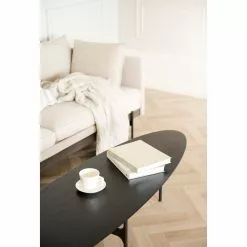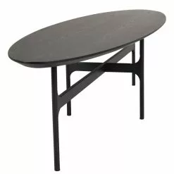 Ajattoman tyylikkäässä Colton-sohvapöydässä näkyy laadukas pohjoismainen design. Korkealaatuinen ovaalin muotoinen pöytälevy on mustaksi lakattua saarniviilua, missä näkyy puun oma kuviointi. Sohvapöydän ovaali muoto antaa pehmeän vaikutelman ja sopii hyvin yhdistettäväksi leveän sohvan kanssa. Ohuet ja sirot metallijalat keventävät pitkän pöydän ilmettä.