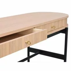 Konsolipöydässä on pehmeästi sulkeutuvat laatikot avaimille ja muille pienesineille. Koristeellinen konsolipöytä on valmistettu valkokuultolakatusta MDF-tammiviilusta ja yksityiskohdat ovat massiivitammea. Pöydän pyöreät muodot huoneeseen mukanaan aivan uudenlaista tunnelmaa ja korkeat ohuet mustat metallijalat tuovat ilmavuutta ja helpottavat siivousta.
