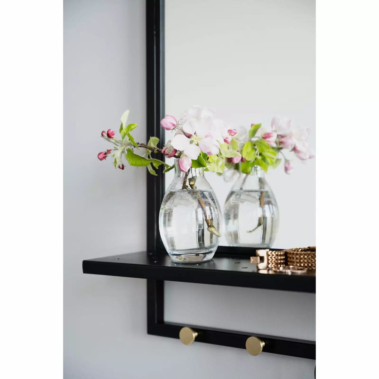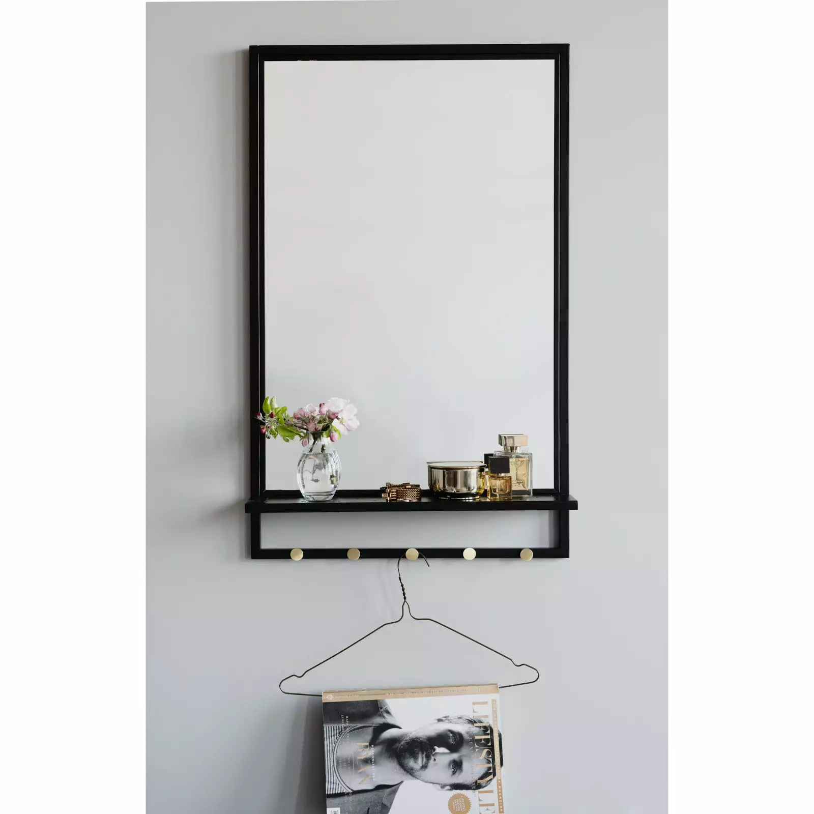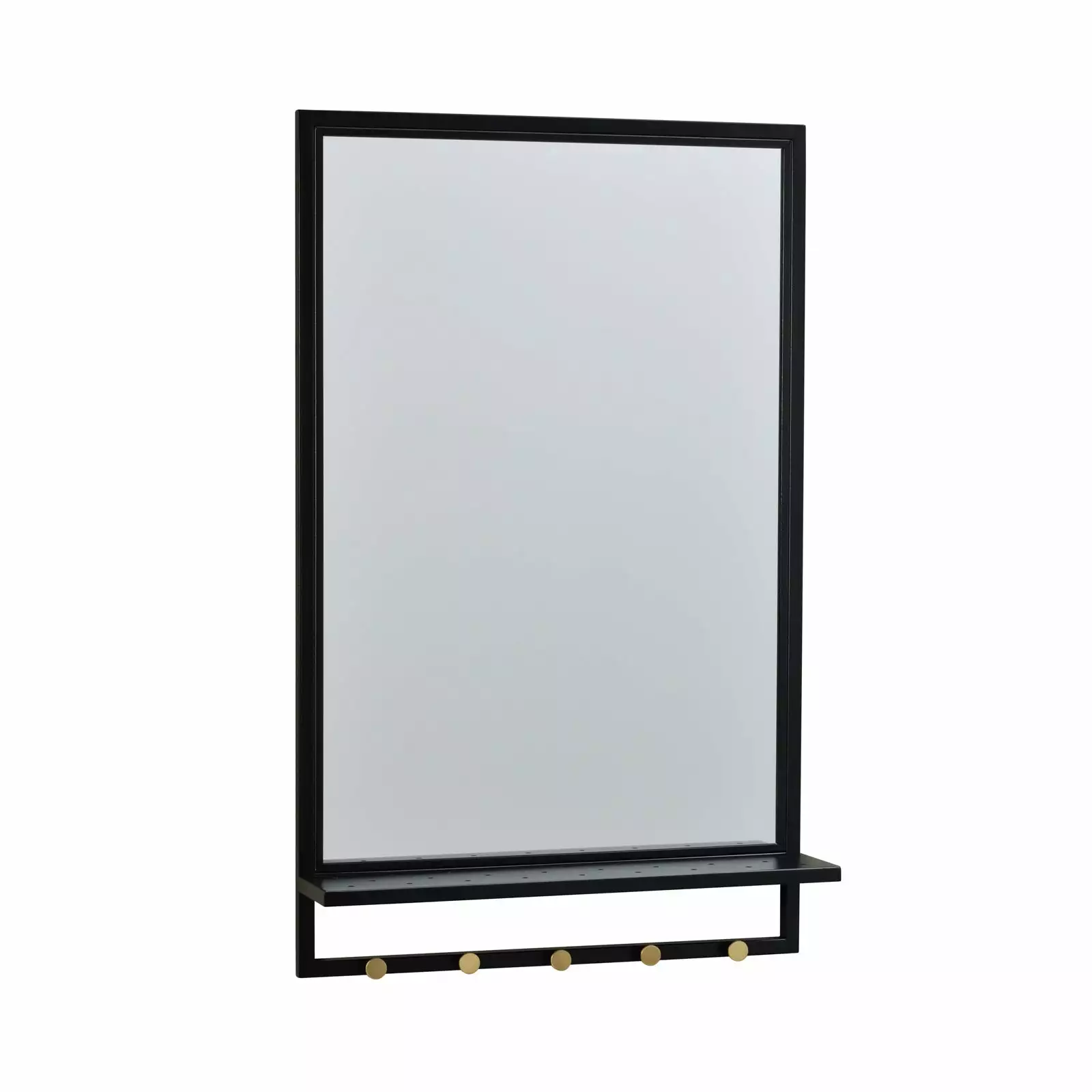 Malone-peili hyllyllä on tyylikäs ja siro seinäpeili, jossa on kauniit kullan väriset yksityiskohdat ja käytännöllinen hyllytaso pienille tavaroille, kuten hiusharjalle tai korurasialle. Peilin musta runko on jauhemaalattua metallia ja hyllyn alapuolella on viisi kultaista ripustinnuppia, jossa voit säilyttää esimerkiksi kauneimmat kaulakorusi kätevästi esillä.