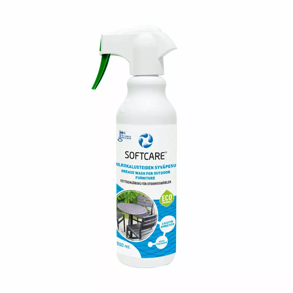 Softcare Ulkokalusteiden ja rakennusten rasvapesuaine on luontoystävällinen puu-, muovi-, sekä polywood-kalusteiden, puu- sekä komposiittipintaisten terassien pesuaine. Sopii vaikeiden öljyn, noen, rasvan, pien, pihkan ja muun vaikean ja pinttyneen lian poistoon. Biohajoava ja kasvispohjainen tuote, joka syväpesee tehokkaasti sisältämättä liuottimia, tai luontoa kuormittavia aineita.