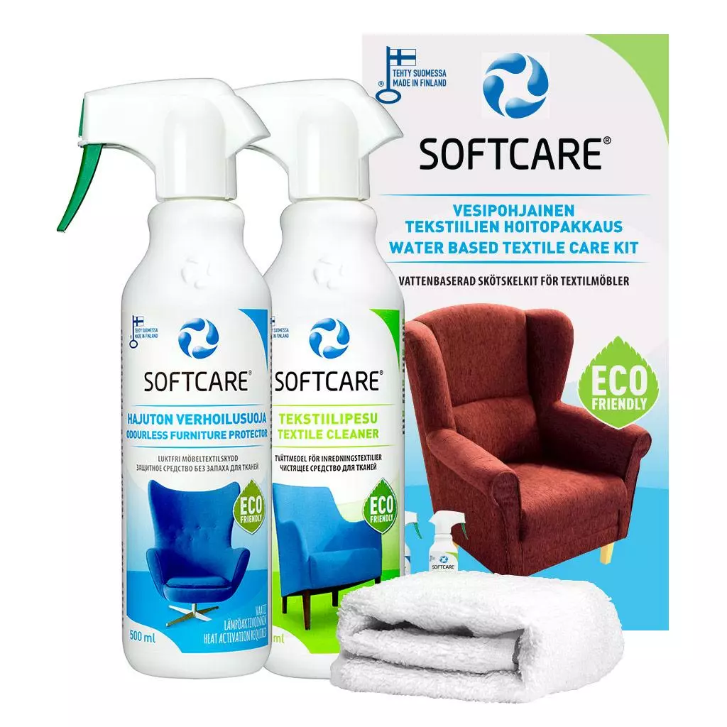 Helppokäyttöisessä Softcare-tuotesarjan vesipohjaisessa tekstiilien hoitopakkauksessa on kaikki tarvittava verhoiltujen tekstiilikalusteiden hoitoon.